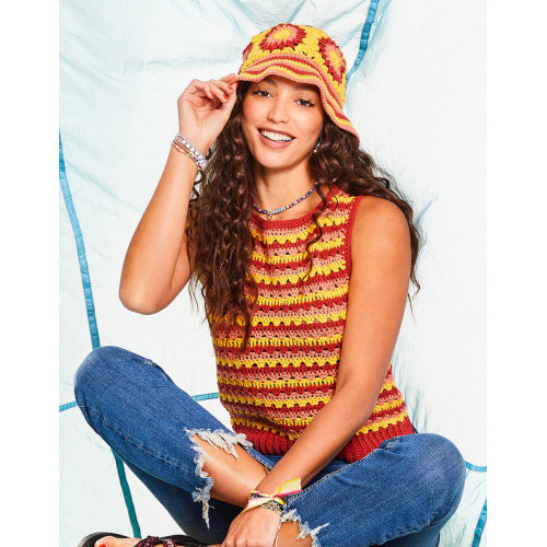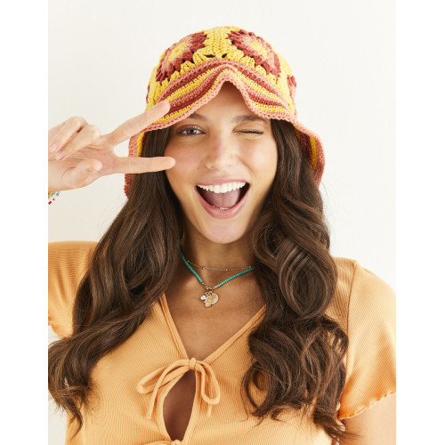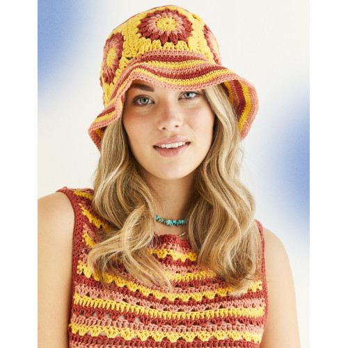 Bucket hats are essential festival wear, a simple accessory that’s bang on trend this Summer. To create this sunflower-inspired bucket hat, you will crochet granny squares for the crown and sides of the hat and then stitch striped double crochet for the brim.